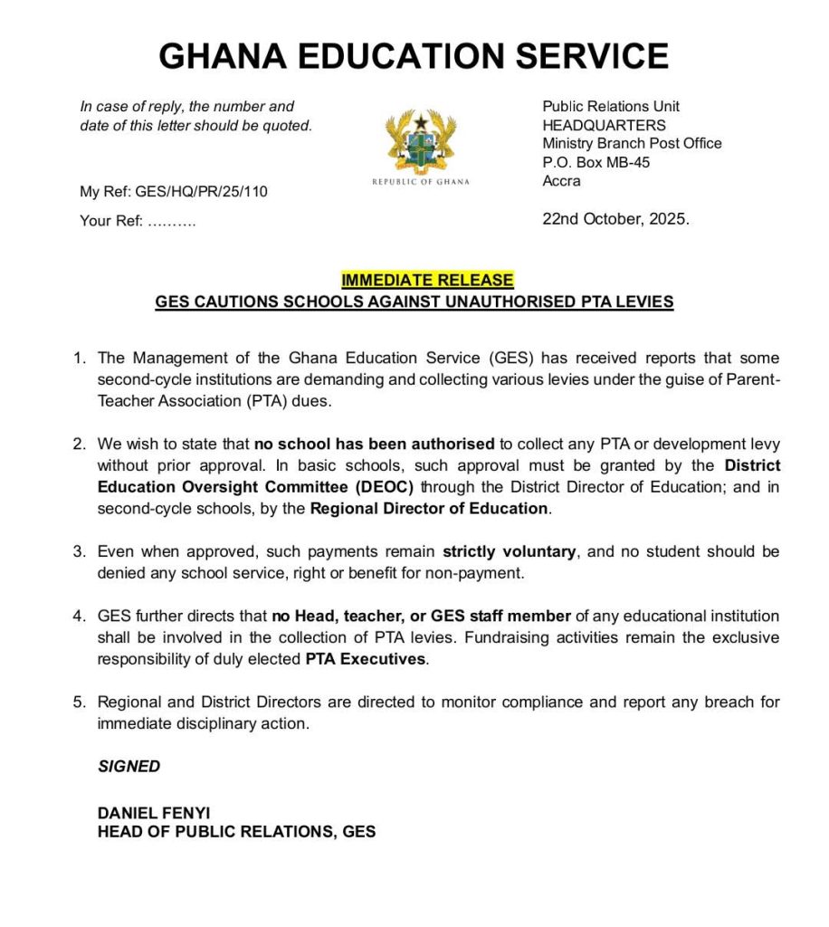 Tamale N/R, October 22, 2025 — The Ghana Education Service (GES) has cautioned heads of schools and educational staff across the country against the collection of unauthorised levies purported to be Parent-Teacher Association (PTA) dues.