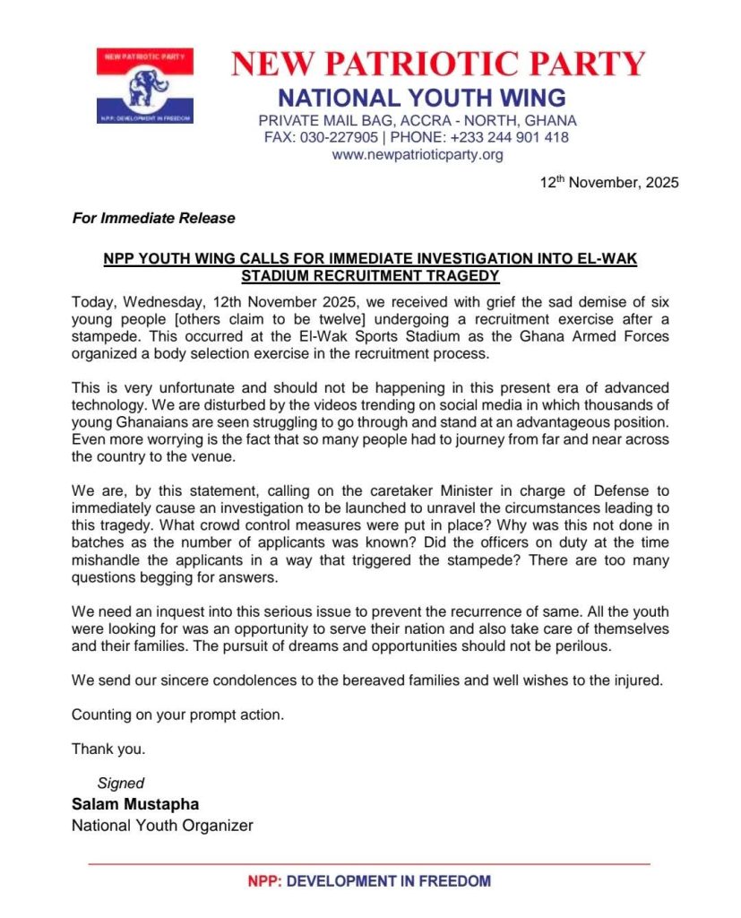 The National Youth Wing of the New Patriotic Party (NPP) has called for an immediate investigation into the tragic incident at the El-Wak Sports Stadium in Accra, where a recruitment exercise by the Ghana Armed Forces reportedly resulted in the deaths of several young applicants.