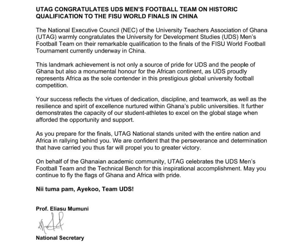 The University Teachers Association of Ghana (UTAG) and the Students’ Representative Council (SRC) of the University for Development Studies (UDS) have extended warm congratulations to the UDS Men’s Football Team following their qualification to the finals of the FISU University World Cup Football in Dalian, China.